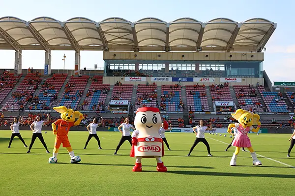 ヤクルトマンがピッチに登場し、キックインセレモニーのプレゼンターを務め会場を沸かせました。